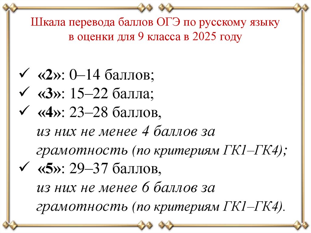Шкала перевода баллов ОГЭ по русскому языкув оценки для 9 класса в 2025 году