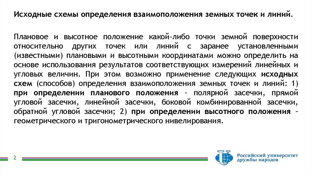 Исходные схемы определения взаимоположенияземных точек и линий.