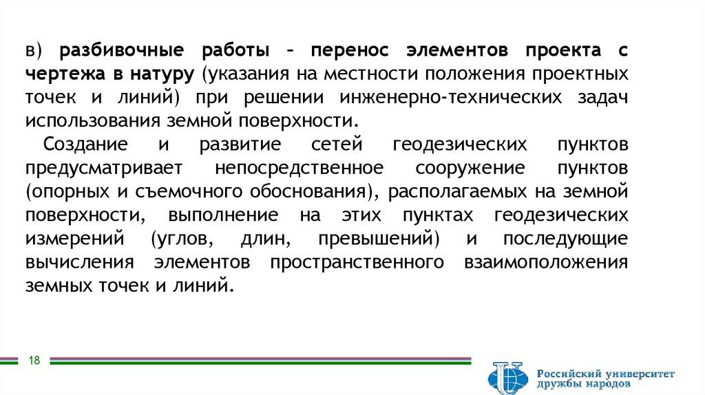 в) разбивочные работы – перенос элементов проекта счертежа в натуру (указания на местности положения проектных