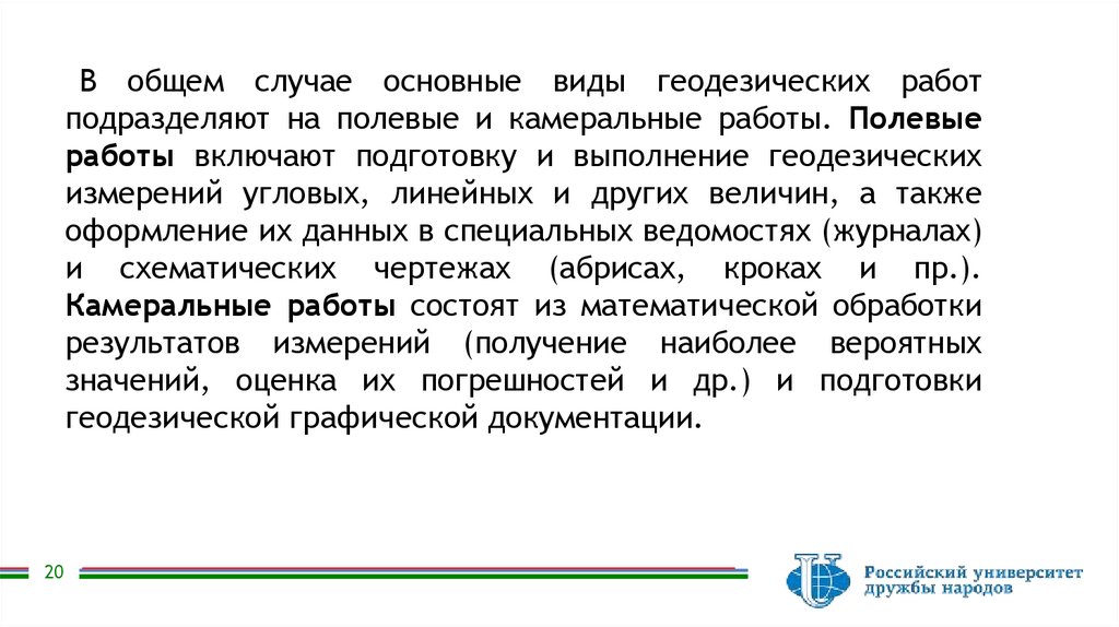 В общем случае основные виды геодезических работподразделяют на полевые и камеральные работы. Полевые