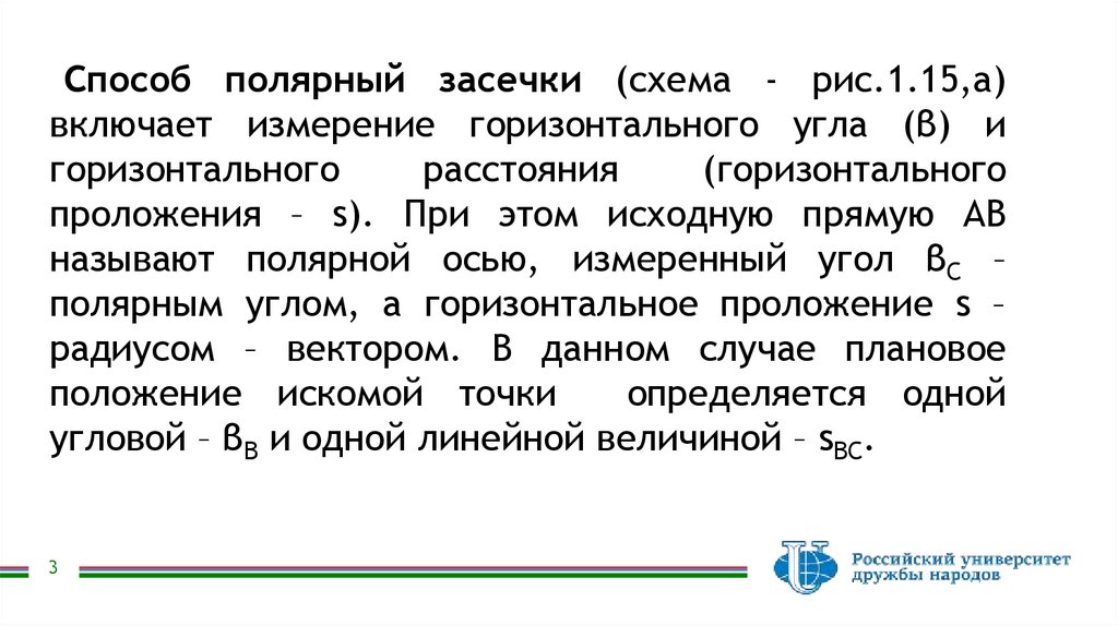 Способ полярный засечки (схема - рис.1.15,а)включает измерение горизонтального угла (β) и