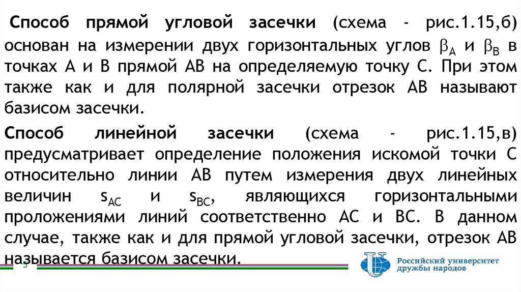 Способ прямой угловой засечки (схема - рис.1.15,б)основан на измерении двух горизонтальных углов А и В в