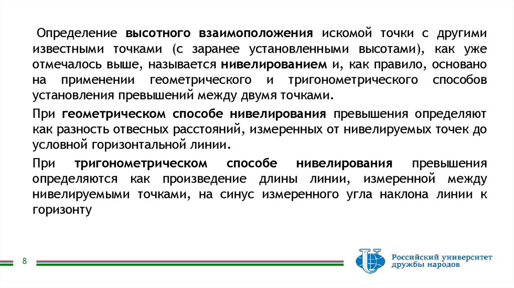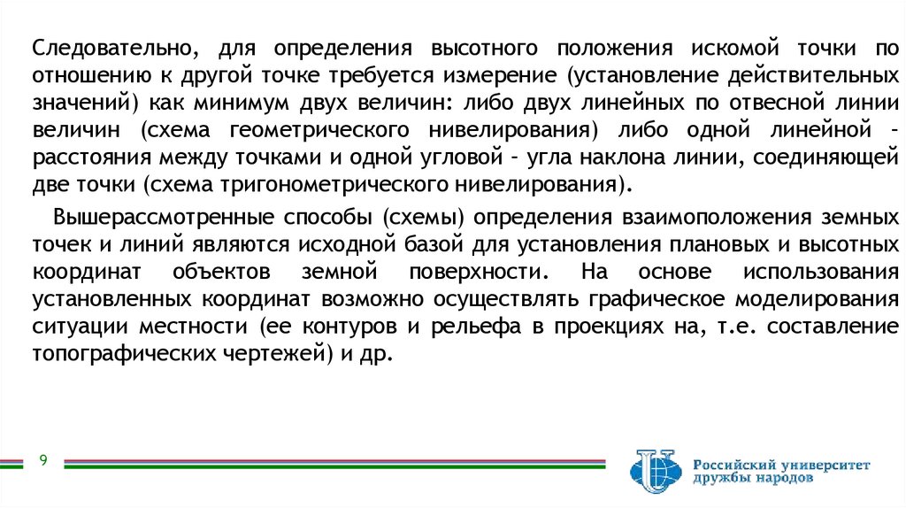 Следовательно, для определения высотного положения искомой точки поотношению к другой точке требуется измерение (установление действительных