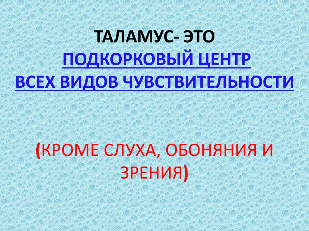 15. ТАЛАМУС- ЭТО ПОДКОРКОВЫЙ ЦЕНТР ВСЕХ ВИДОВ ЧУВСТВИТЕЛЬНОСТИ (КРОМЕ СЛУХА, ОБОНЯНИЯ И ЗРЕНИЯ)