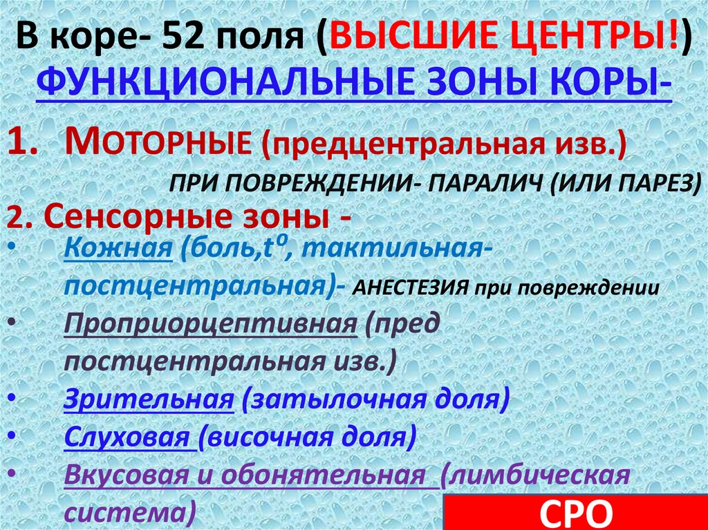 ФУНКЦИОНАЛЬНЫЕ ЗОНЫ КОРЫ1. МОТОРНЫЕ (предцентральная изв.)ПРИ ПОВРЕЖДЕНИИ- ПАРАЛИЧ (ИЛИ ПАРЕЗ)