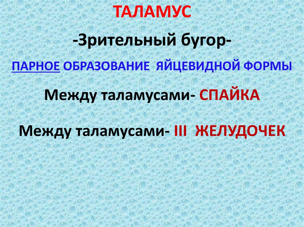 -Зрительный бугорПАРНОЕ ОБРАЗОВАНИЕ ЯЙЦЕВИДНОЙ ФОРМЫМежду таламусами- СПАЙКА