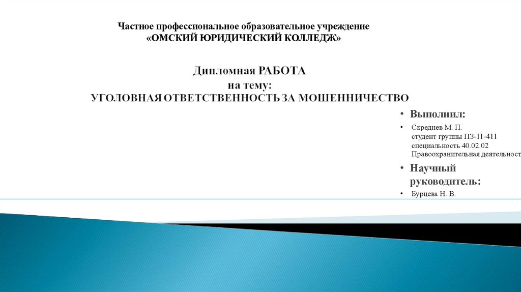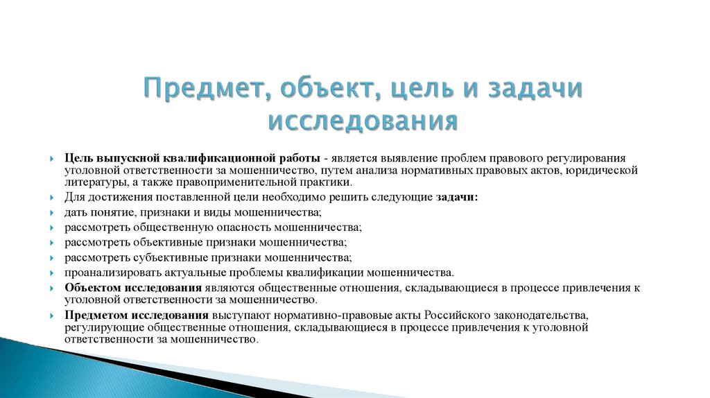 Цель выпускной квалификационной работы - является выявление проблем правового регулированияуголовной ответственности за мошенничество, путем анализа нормативных правовых актов, юридической
