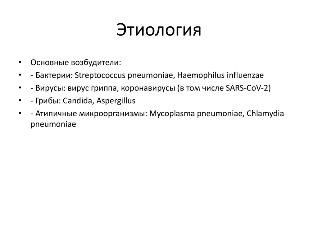 - Атипичные микроорганизмы: Mycoplasma pneumoniae, Chlamydia