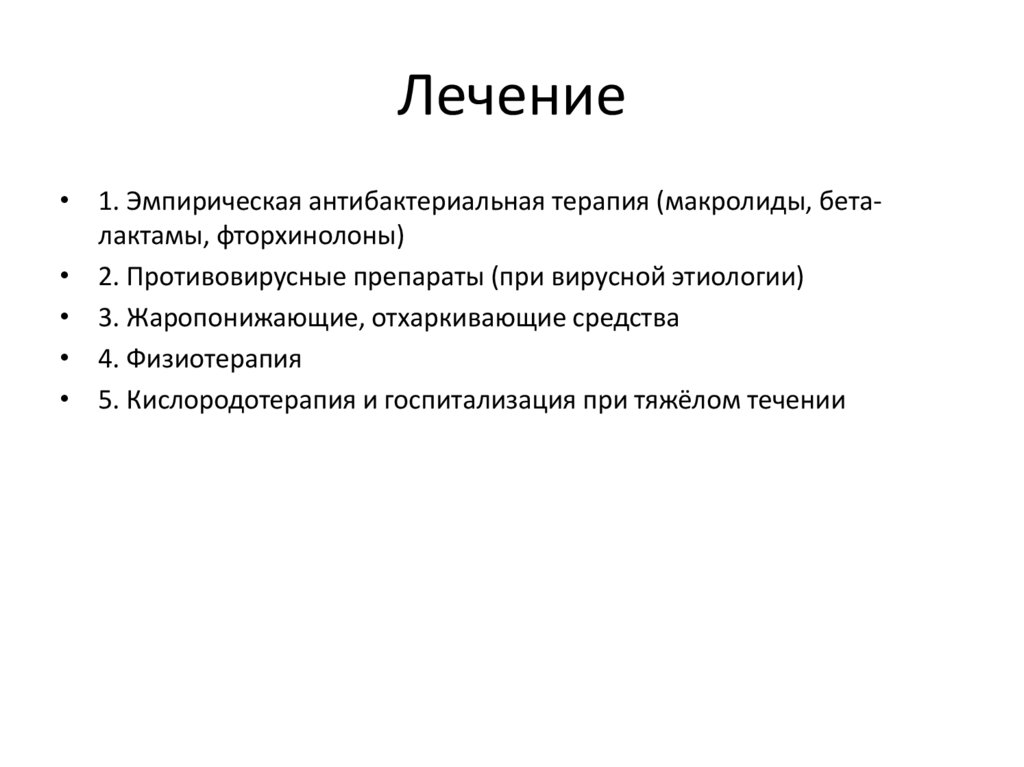 Лечение• 1. Эмпирическая антибактериальная терапия (макролиды, беталактамы, фторхинолоны)