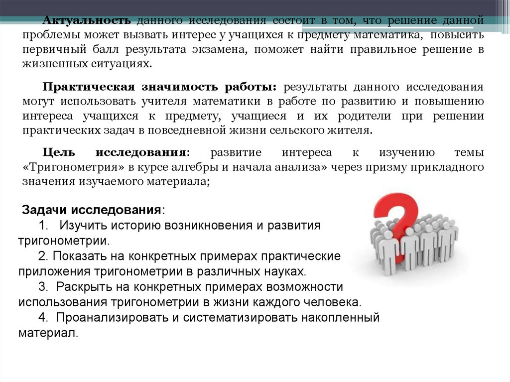 Актуальность данного исследования состоит в том, что решение даннойпроблемы может вызвать интерес у учащихся к предмету математика, повысить