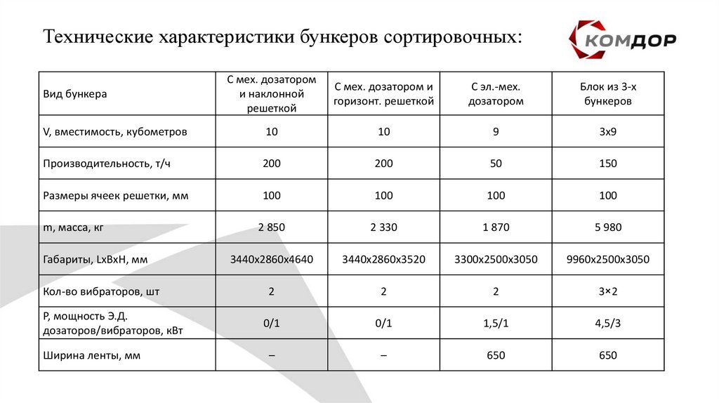 Технические характеристики бункеров сортировочных:С мех. дозатором