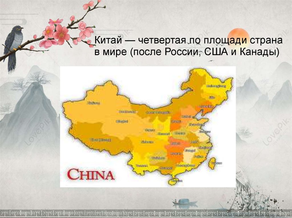 Китай — четвертая по площади странав мире (после России, США и Канады)