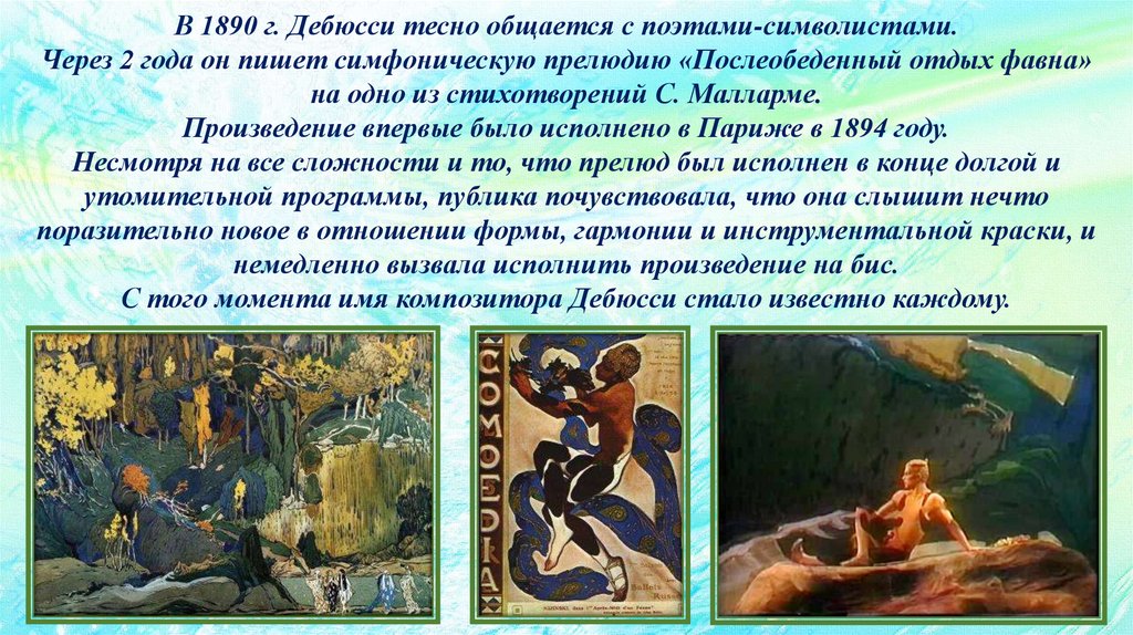 В 1890 г. Дебюсси тесно общается с поэтами-символистами.Через 2 года он пишет симфоническую прелюдию «Послеобеденный отдых фавна»