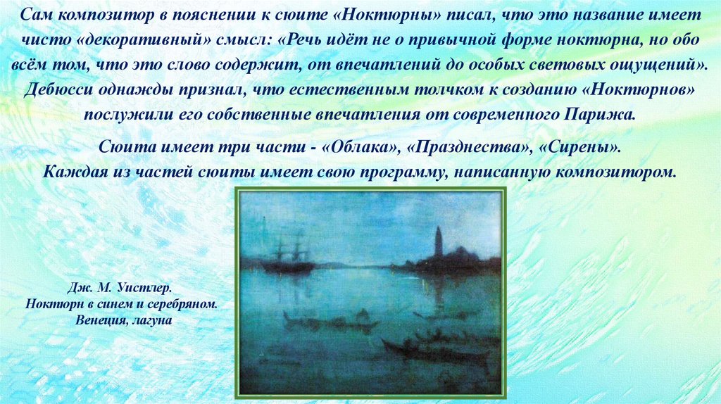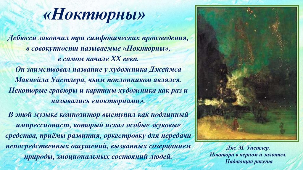 Дебюсси однажды признал, что естественным толчком к созданию «Ноктюрнов»