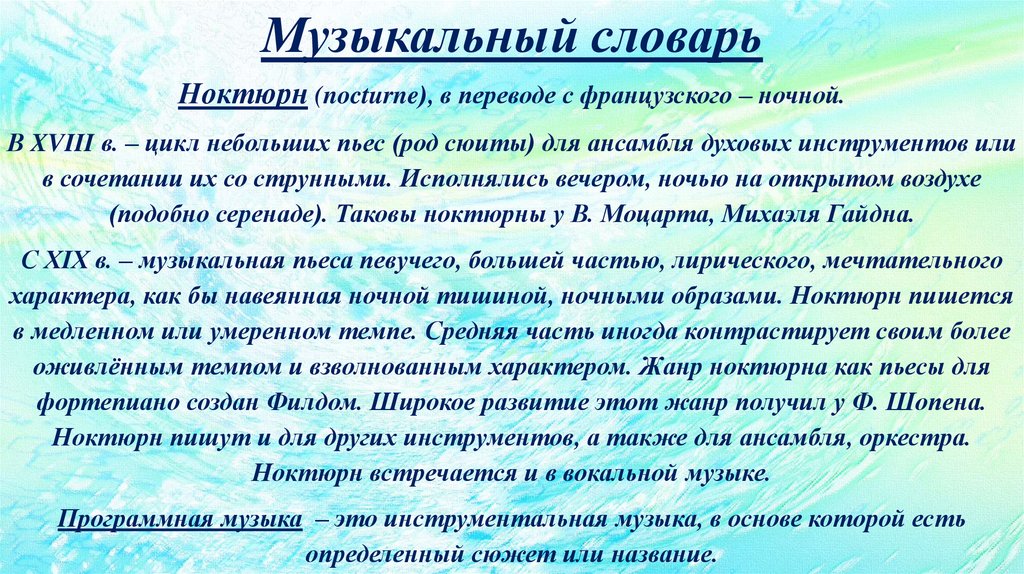 Музыкальный словарьНоктюрн (nocturne), в переводе с французского – ночной.