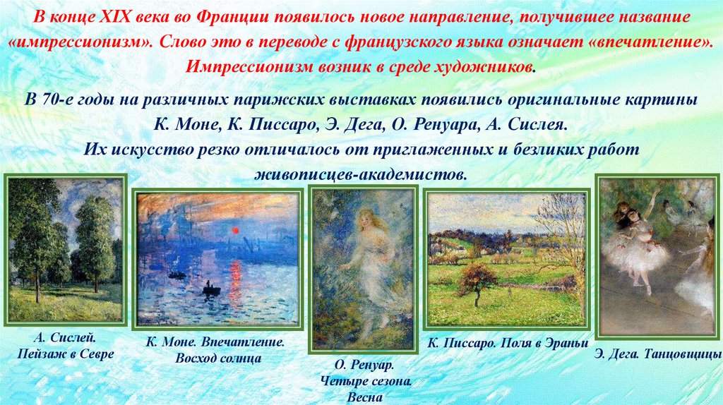 К. Моне, К. Писсаро, Э. Дега, О. Ренуара, А. Сислея.