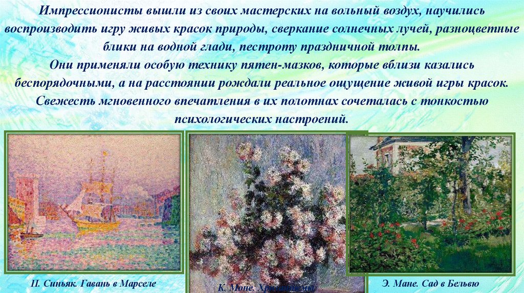 Импрессионисты вышли из своих мастерских на вольный воздух, научилисьвоспроизводить игру живых красок природы, сверкание солнечных лучей, разноцветные