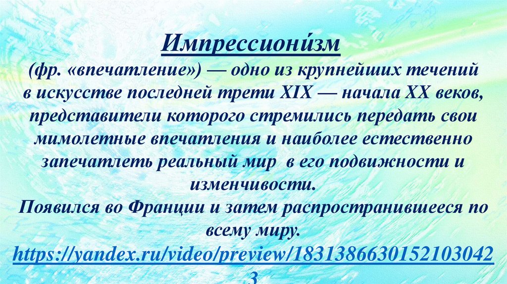 В конце XIX века во Франции появилось новое направление, получившее название«импрессионизм». Слово это в переводе с французского языка означает «впечатление».