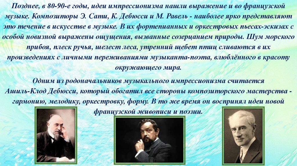 Позднее, в 80-90-е годы, идеи импрессионизма нашли выражение и во французскоймузыке. Композиторы Э. Сати, К. Дебюсси и М. Равель - наиболее ярко представляют