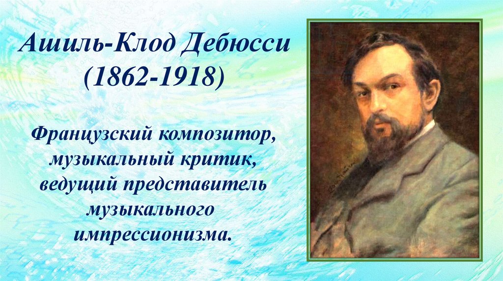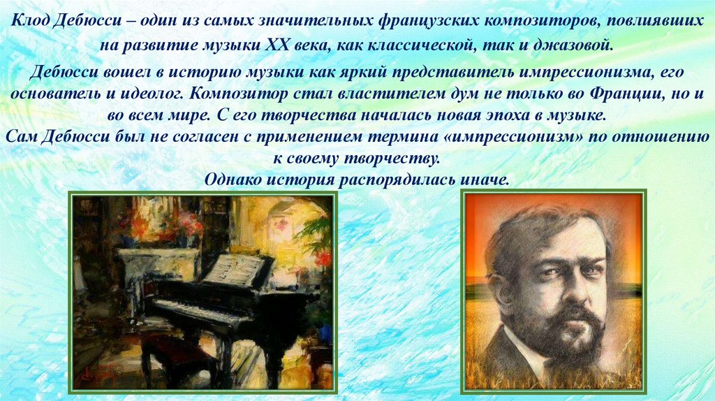 Клод Дебюсси – один из самых значительных французских композиторов, повлиявшихна развитие музыки ХХ века, как классической, так и джазовой.