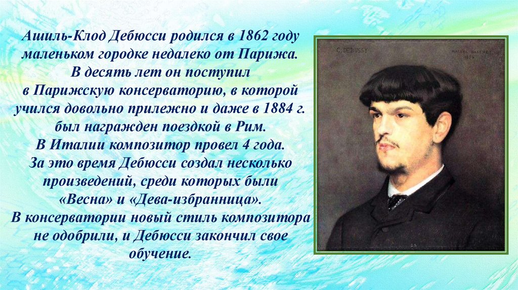 Ашиль-Клод Дебюсси родился в 1862 годумаленьком городке недалеко от Парижа.