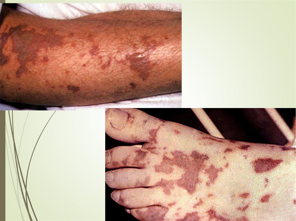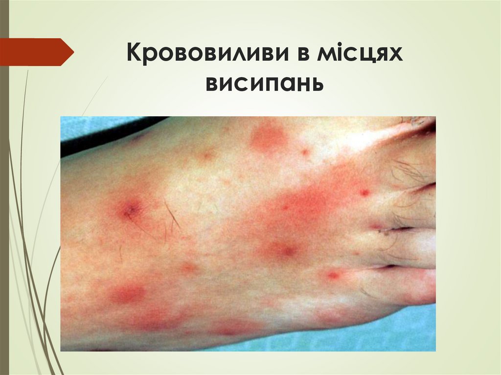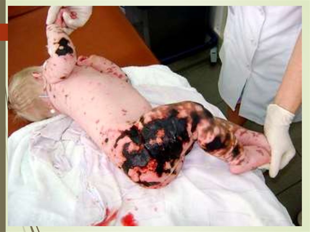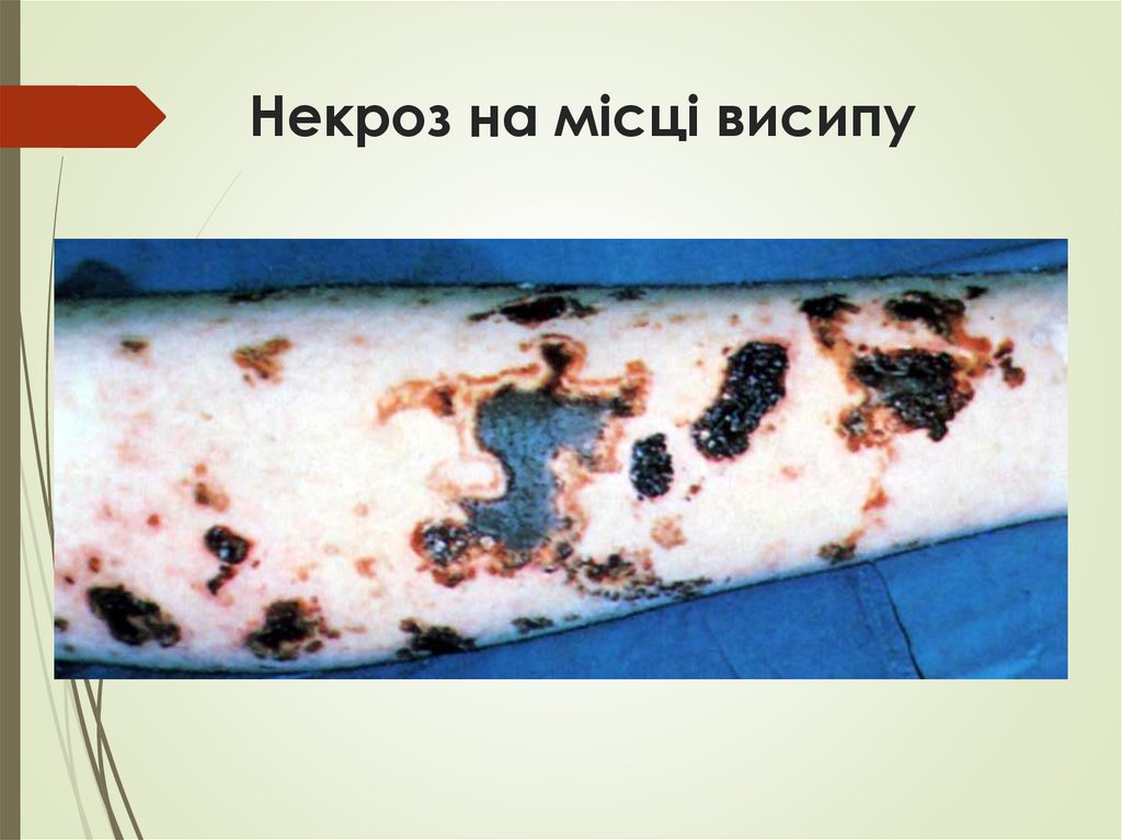 При менінгококцемії приєднується:геморагічний висип зірчастої форми діаметором 25мм, в центрі утворюється некроз, після якого