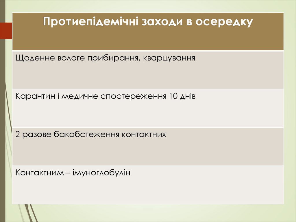 Протиепідемічні заходи в осередкуЩоденне вологе прибирання, кварцування