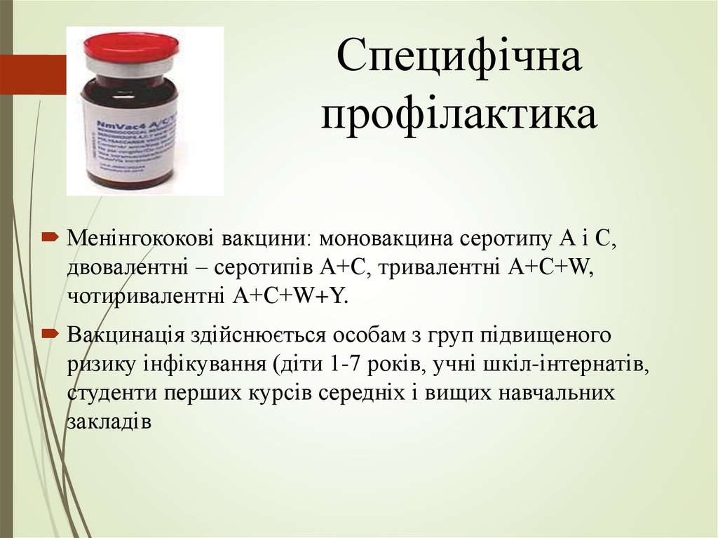 Менінгококові вакцини: моновакцина серотипу А і С,двовалентні – серотипів А+С, тривалентні А+С+W,