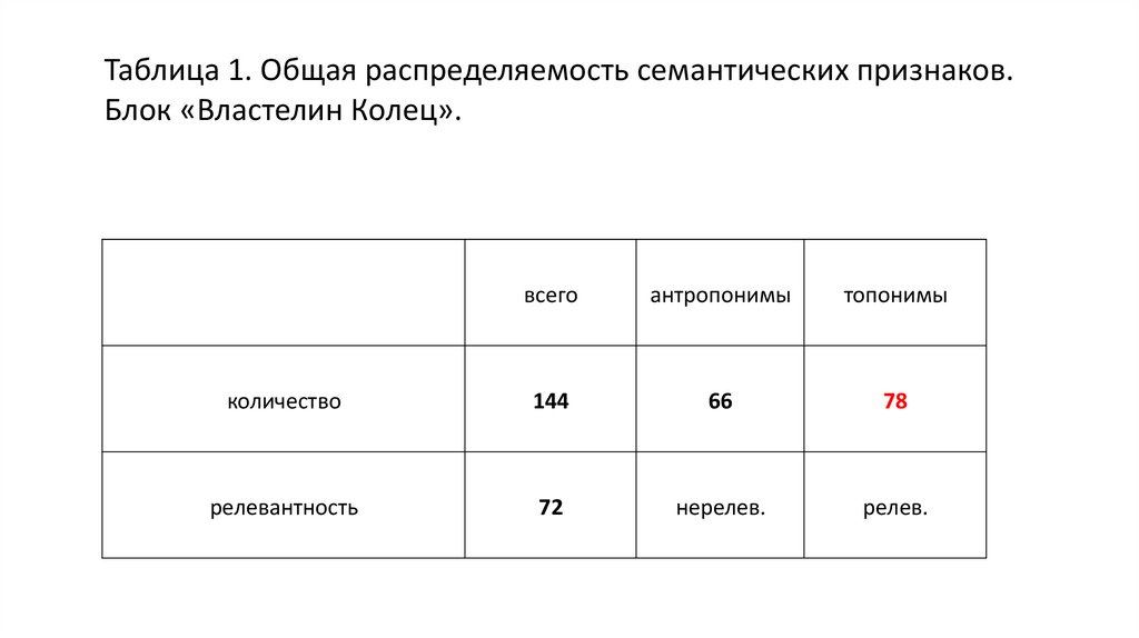 Таблица 1. Общая распределяемость семантических признаков.Блок «Властелин Колец».