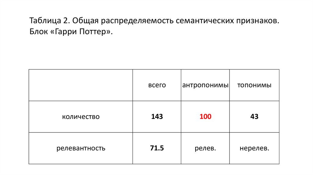 Таблица 2. Общая распределяемость семантических признаков.Блок «Гарри Поттер».