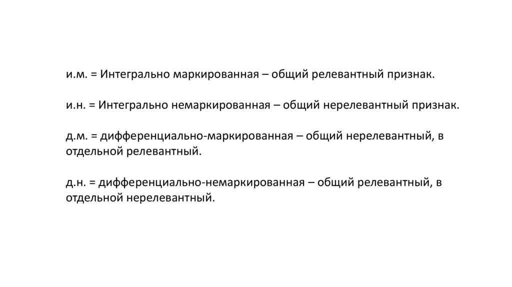 и.м. = Интегрально маркированная – общий релевантный признак.и.н. = Интегрально немаркированная – общий нерелевантный признак.