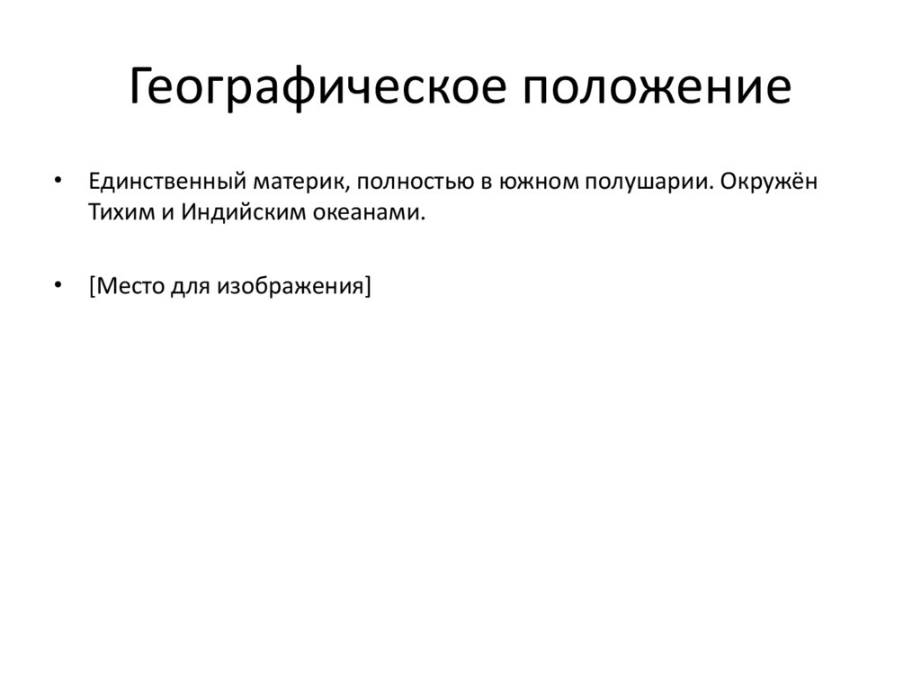 Географическое положение• Единственный материк, полностью в южном полушарии. Окружён