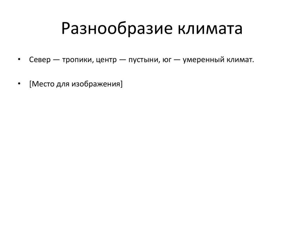 Разнообразие климата• Север — тропики, центр — пустыни, юг — умеренный климат.