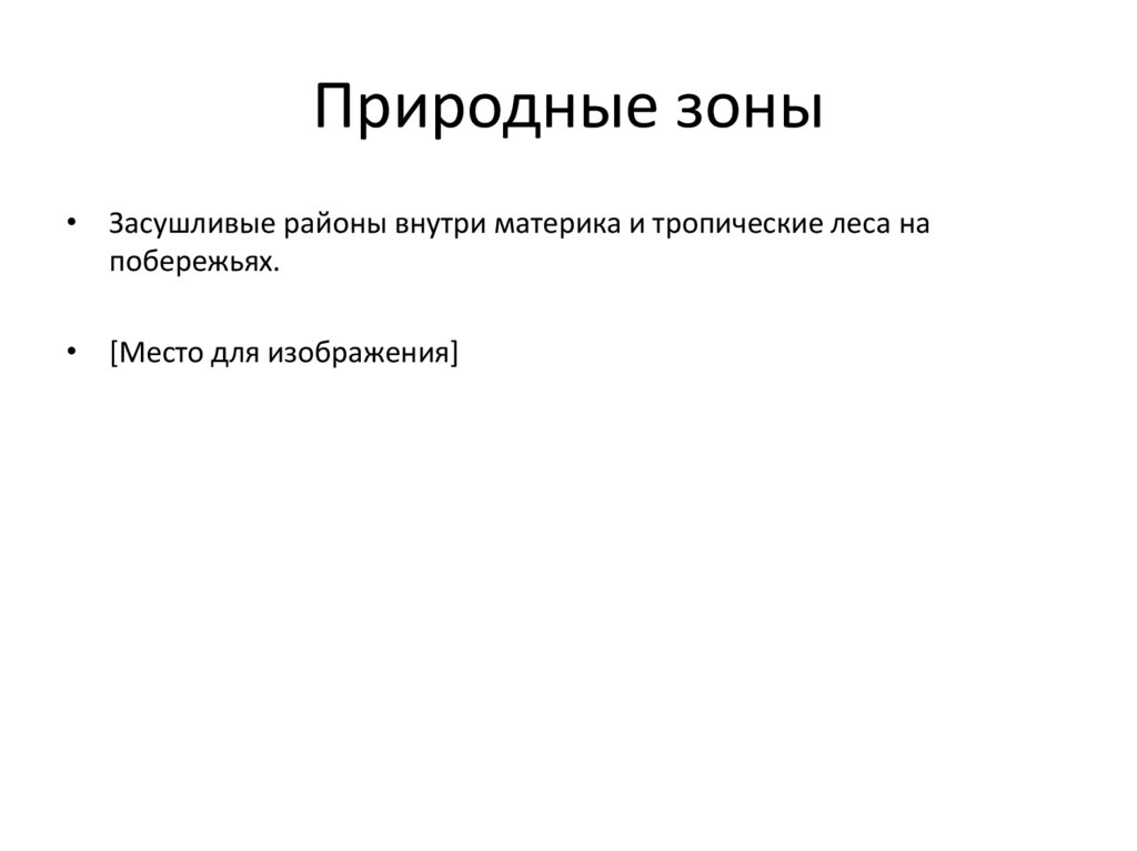 Природные зоны• Засушливые районы внутри материка и тропические леса на