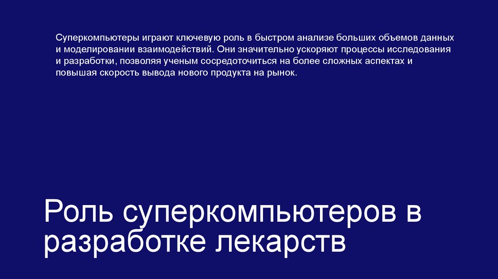 Суперкомпьютеры играют ключевую роль в быстром анализе больших объемов данныхи моделировании взаимодействий. Они значительно ускоряют процессы исследования
