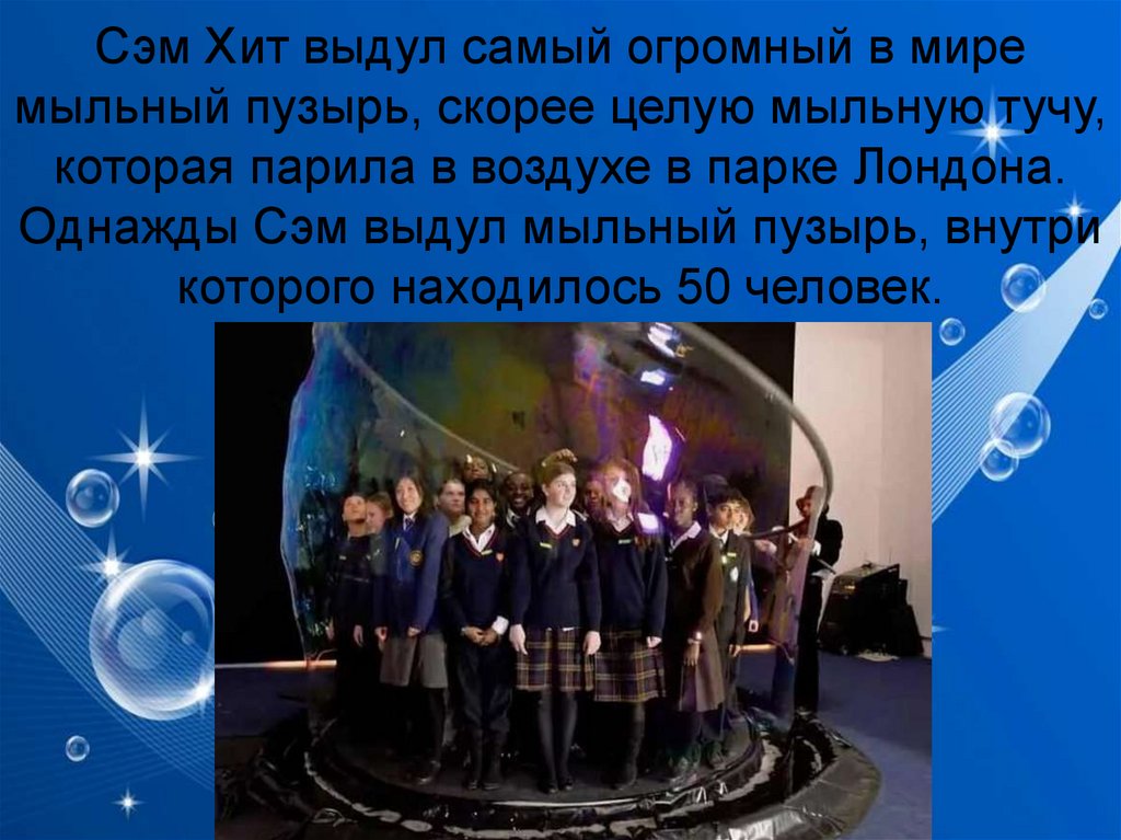 Сэм Хит выдул самый огромный в миремыльный пузырь, скорее целую мыльную тучу,