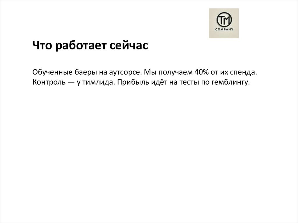 Что работает сейчасОбученные баеры на аутсорсе. Мы получаем 40% от их спенда.