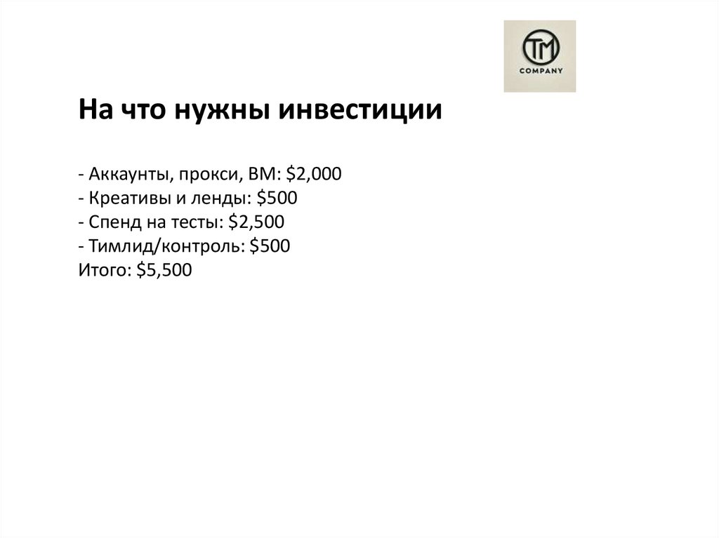 На что нужны инвестиции- Аккаунты, прокси, BM: $2,000