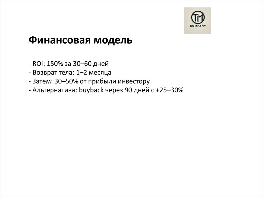 Финансовая модель- ROI: 150% за 30–60 дней