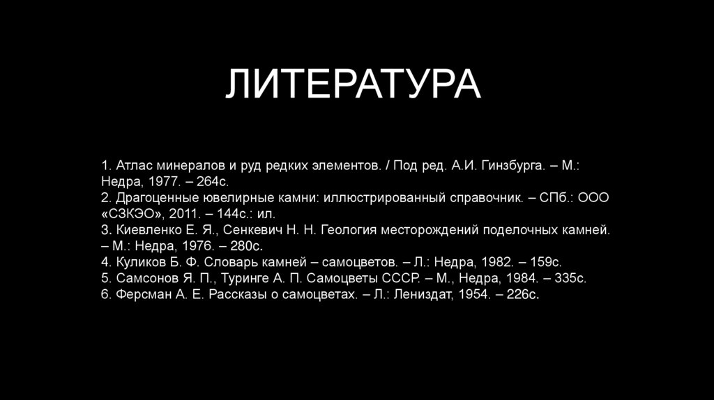 4. Куликов Б. Ф. Словарь камней – самоцветов. – Л.: Недра, 1982. – 159с.