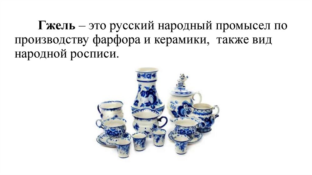 Гжель – это русский народный промысел попроизводству фарфора и керамики, также вид
