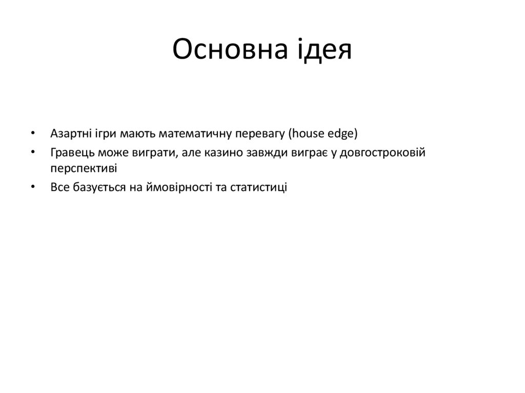 Основна ідеяАзартні ігри мають математичну перевагу (house edge)