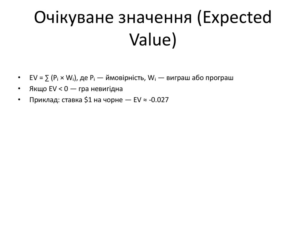 EV = ∑ (Pᵢ × Wᵢ), де Pᵢ — ймовірність, Wᵢ — виграш або програш