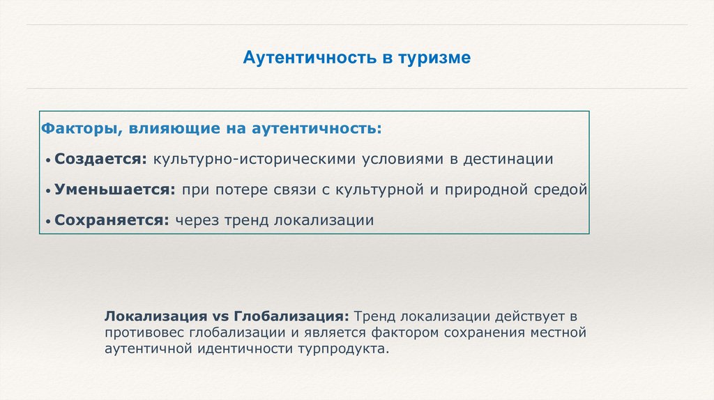 Аутентичность в туризмеФакторы, влияющие на аутентичность: