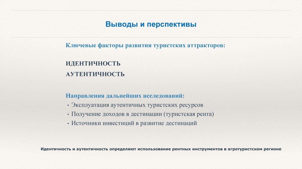Выводы и перспективыКлючевые факторы развития туристских аттракторов: