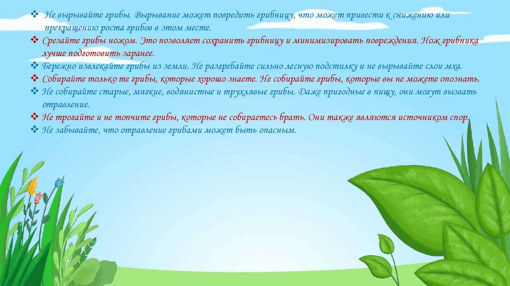 Не вырывайте грибы. Вырывание может повредить грибницу, что может привести к снижению илипрекращению роста грибов в этом месте.