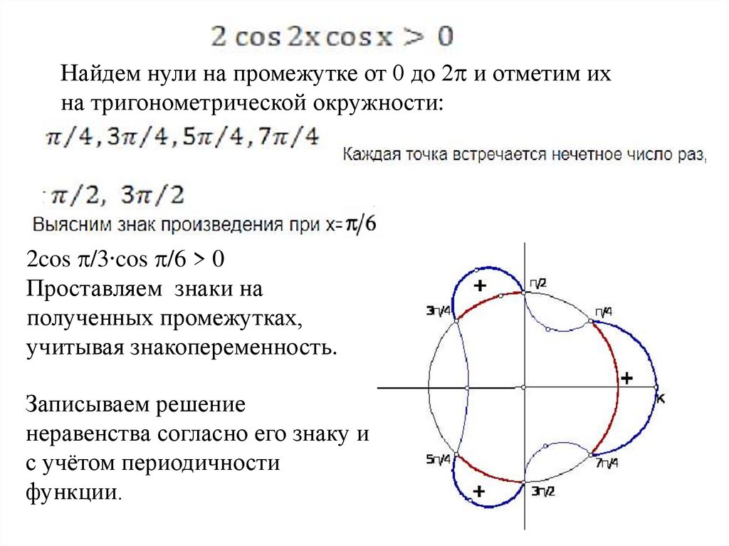 Найдем нули на промежутке от 0 до 2 и отметим ихна тригонометрической окружности: