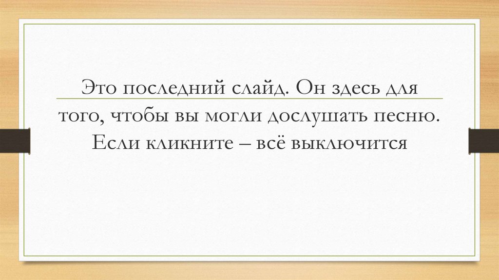 Это последний слайд. Он здесь длятого, чтобы вы могли дослушать песню.