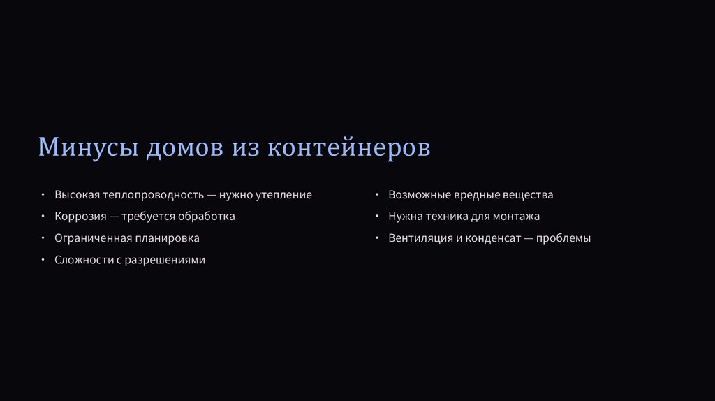 Минусы домов из контейнеров• Высокая теплопроводность — нужно утепление