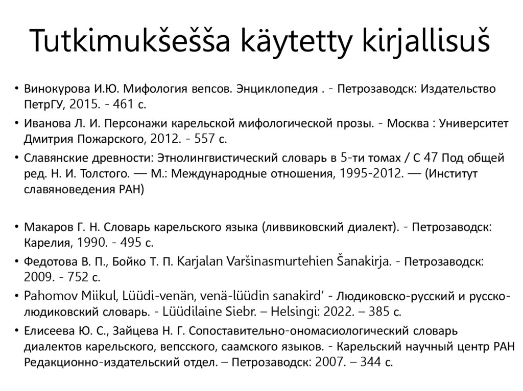Tutkimukšešša käytetty kirjallisuš• Винокурова И.Ю. Мифология вепсов. Энциклопедия . - Петрозаводск: Издательство
